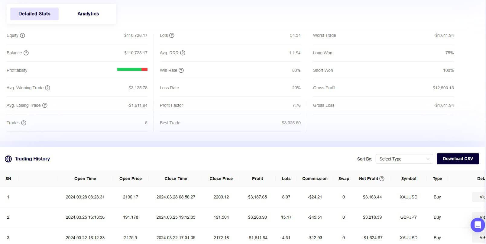Comparing FTMO vs FundedNext, FundedNext gives a more-in-depth analytics but with a less modern an UX friendly approach. The dashboard also shows the best metrics you need to know and track as a prop trader.